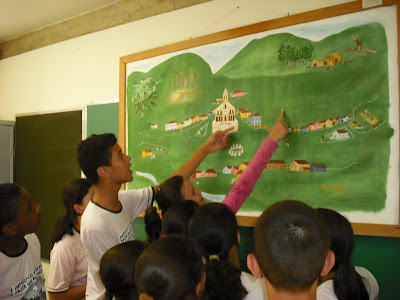 Com os alunos do 9º ano foi trabalhado o Avançando na prática da página 56, tendo como objetivo a produção de texto a partir de uma imagem, em que caberiam, seguramente, frases nominais, ainda que não exclusivas. Para esse trabalho foi escolhido um quadro do pintor Mário Carvalho, que retrata a origem da cidade de Desterro do Melo. Foi seguido passo a passo os itens da proposta a fim de permitir uma boa observação. A seguir foi solicitado que descrevessem a imagem e expressassem a opinião sobre ela. Depois disso produziram um texto descrevendo a imagem e foi proposto que lessem as produções. Os alunos gostaram muito dessa atividade, principalmente porque puderam entender como objetos e imagens podem trazer a história de um tempo passado.